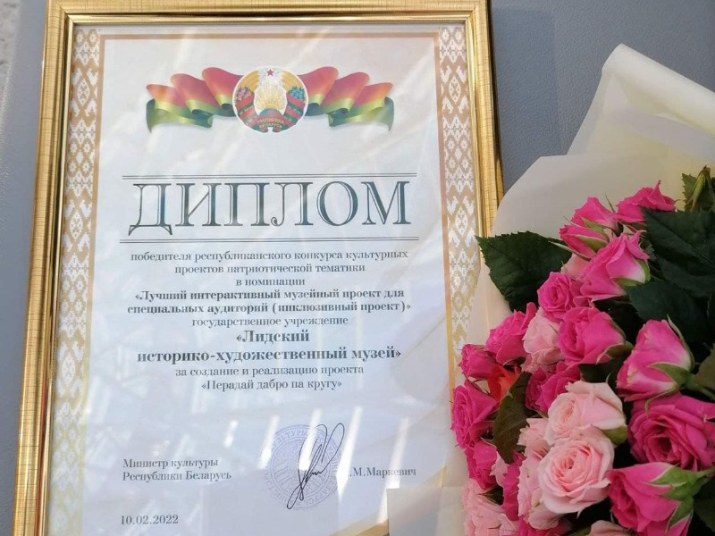 Дипломом ПОБЕДИТЕЛЯ РЕСПУБЛИКАНСКОГО КОНКУРСА КУЛЬТУРНЫХ ПРОЕКТОВ патриотической тематики награждён Лидский историко-художественный музей за инклюзивный проект «Передай добро по кругу».